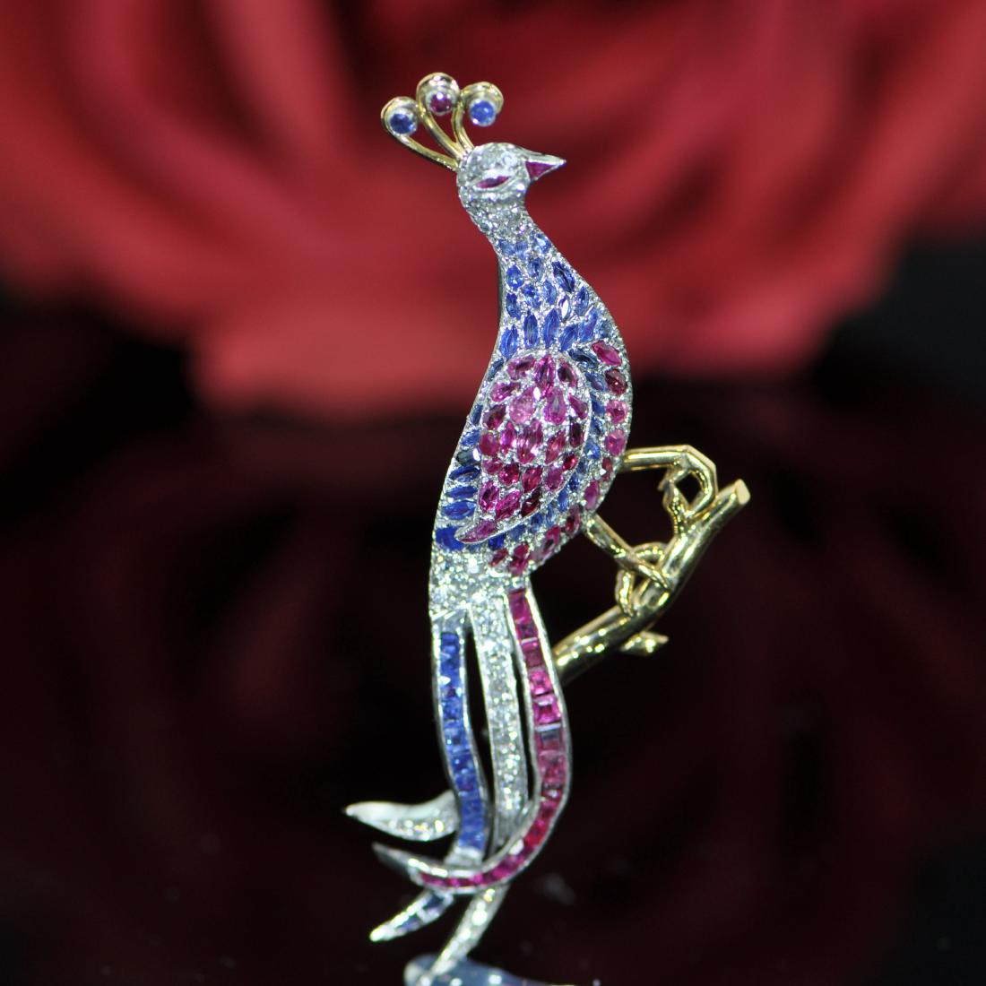 Diamond Sapphire and Ruby Peacock Brooch