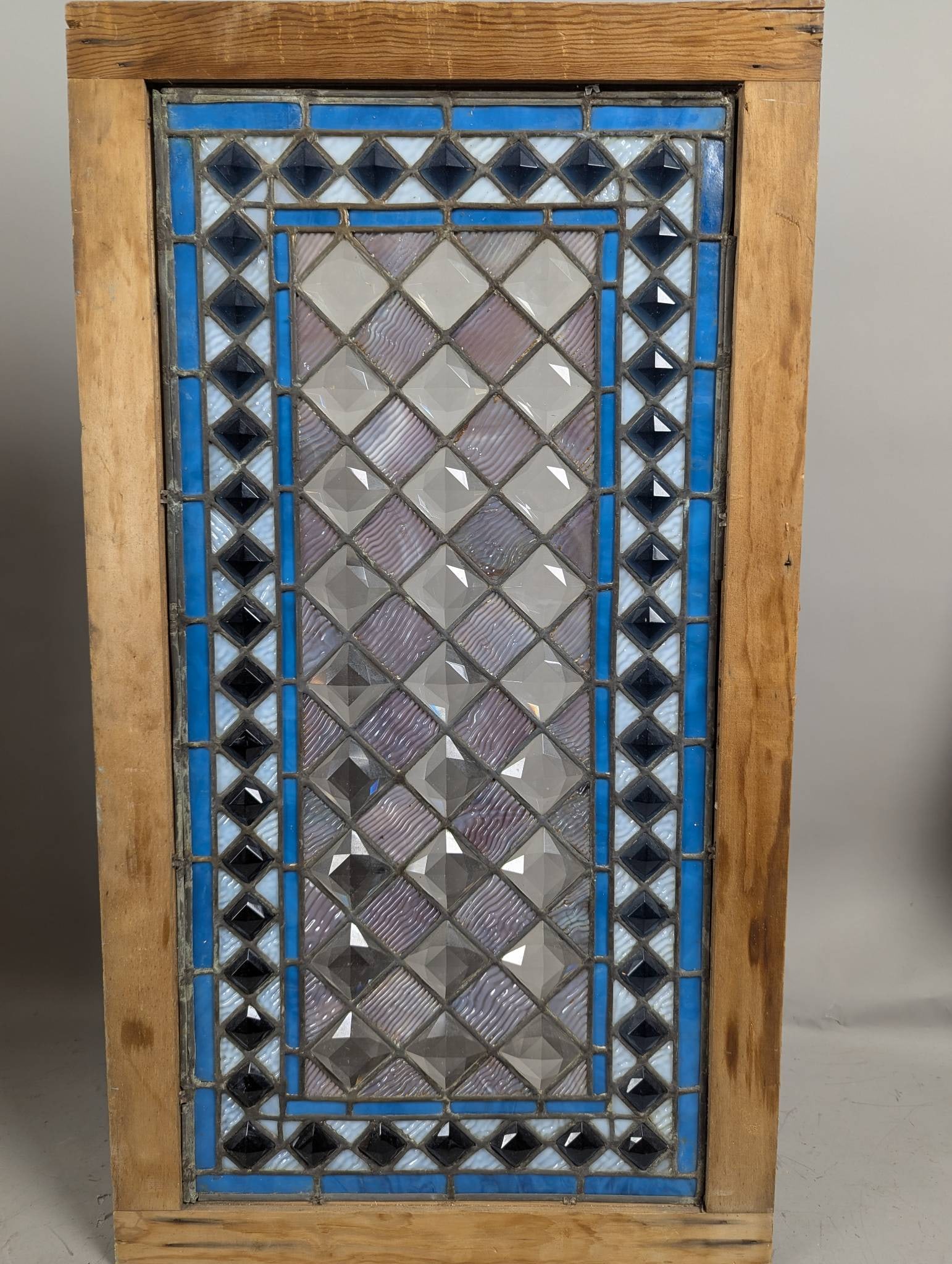 Antique Leaded Stained Glass Window With Diamond Shaped Jewels