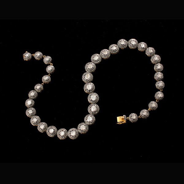 SoldDiamond, silver gilt necklaceDiamond silver gilt necklace Featuring a blackened silver open link measuring approximately 4.2 mm completed by a diamond accented silver rose gilt lobster clasp forming a 32 inch necklace gross weighSee Sold Price