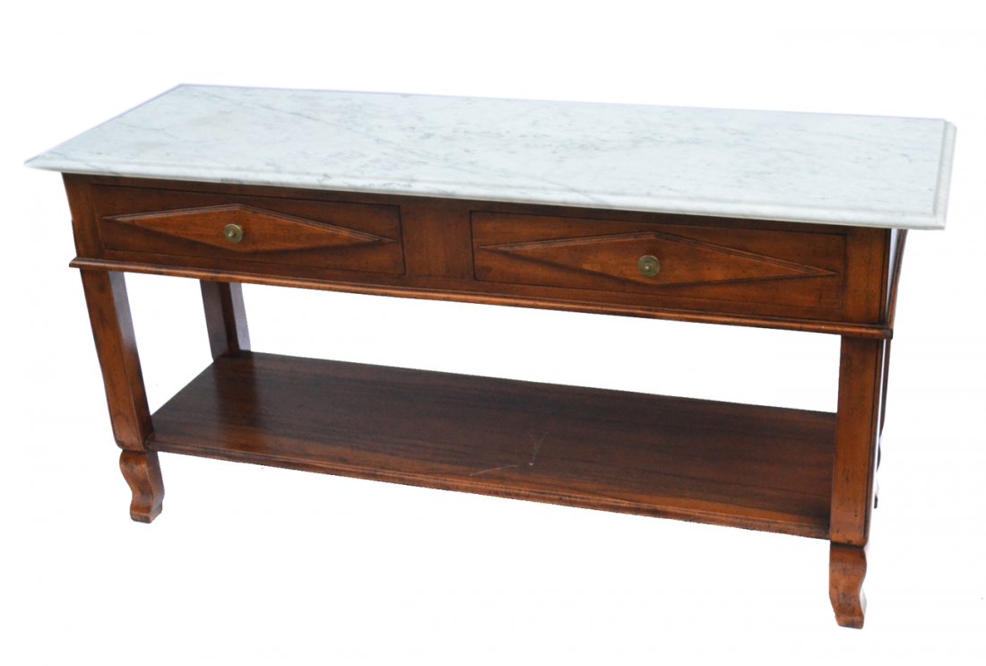SoldVintage Directoire Style Marble Top SideboardA mahogany sideboard in a classic Directoire style with a projecting center section. Multiple drawers overall. Frieze drawers with compartments, lower deeper drawers. Brass banding on the drawers andSee Sold Price