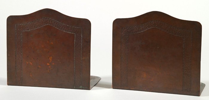 SoldPair of Arts & Crafts Hammered Copper BookendsPair of Arts & Crafts hammered copper bookends with landscape cutout design and "S" motif cutout. Unsigned. Excellent original patina. 5.75"h 4 5/8"w. 5% of this lot will benefit The Dirk van Erp FoSee Sold Price