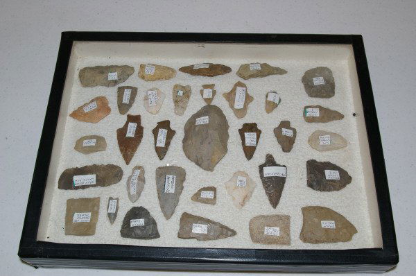 Display Case With Assorted Indian Arrowheads