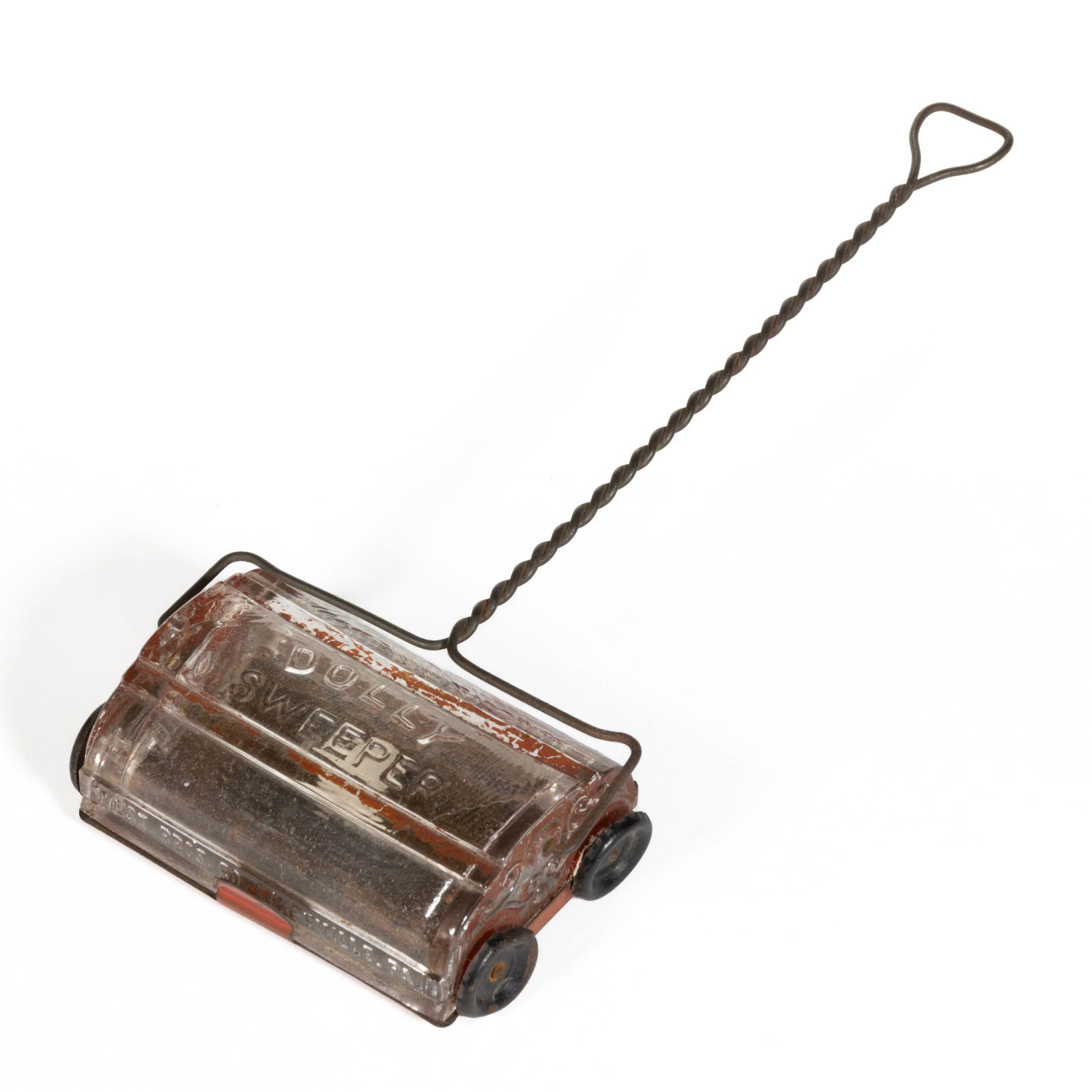 DOLLY SWEEPER / CARPET SWEEPER FIGURAL PRESSED GLASS CANDY CONTAINER