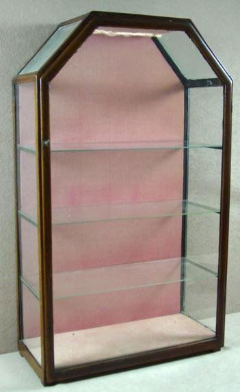 SoldSmall Antique Wall Curio or Display Cabinet.This Victorian style display cabinet has a brass gallery top, a bevelled glass door, brass decorations, and two inner shelves with a fabric cover. There are some scratches and scuff marks, but overallSee Sold Price