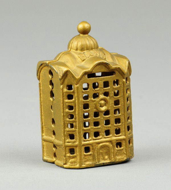 SoldThree Early Cast Iron Building Still BanksThree Early Cast Iron Building Still Banks. A.C. Williams Colonial House Bank, ca. 1910 and Domed Bank, ca. 1899. J & E Stevens Home Savings Bank, ca. 1889, measures 4 1/2 X 6 X 3 1/4 inches.See Sold Price
