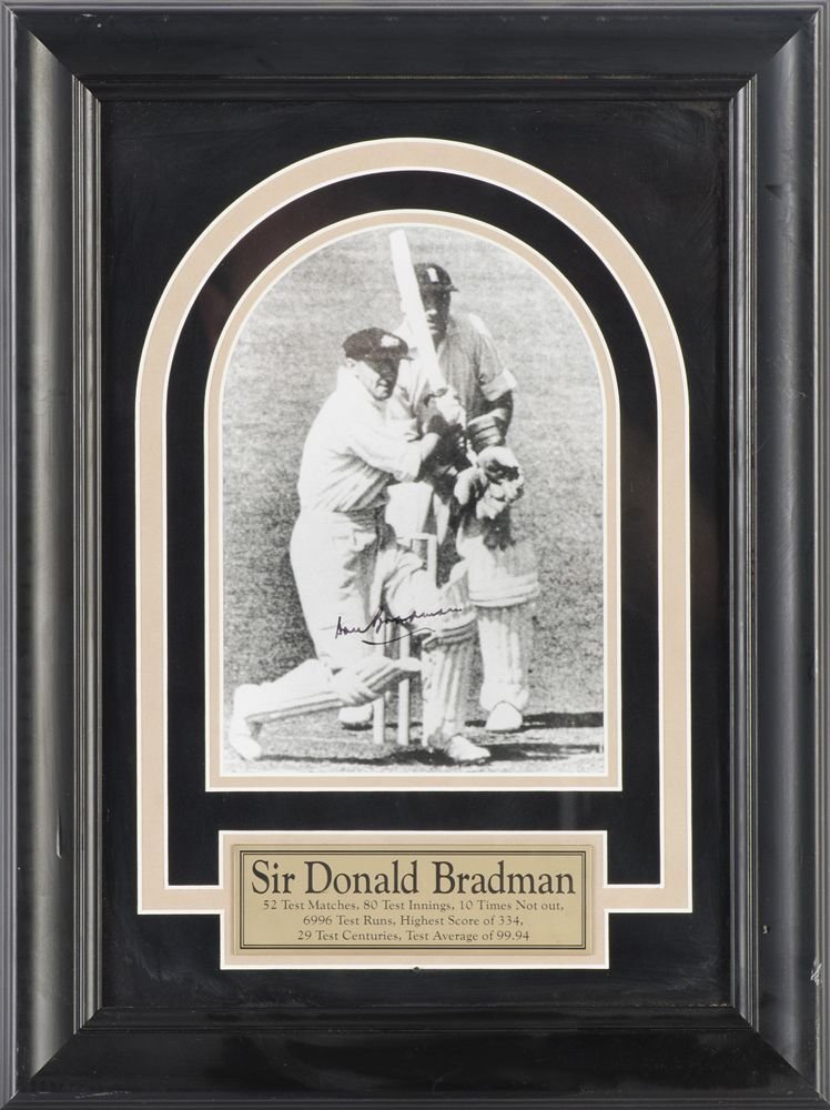 DON BRADMAN, signed photograph, window mounted, framed