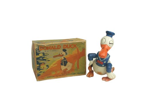 SoldDonald Duck WalkerJapan circa 1940's. Made of Tin and Celluloid. 5.5" Tall. A scarce and desirable celluloid toy. Works Well. Excellent Condition.See Sold Price