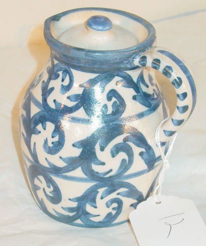SoldDORCHESTER POTTERY SYRUP PITCHERS WITH COVERS, LOT OFDORCHESTER POTTERY SYRUP PITCHERS WITH COVERS, LOT OF THREE, blue and white, including a blueberry pattern example, each with thumbprints to underside, and signed "N. Ricci / Fecit" and "C. A. H.", onSee Sold Price