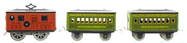 SoldDorfan Prewar Rare #99-100 O Gauge Trolley and TwoDorfan Prewar Rare #99-100 O Gauge Trolley and Two Passenger Cars, with #120 Set Box Lid, in overall C6.See Sold Price