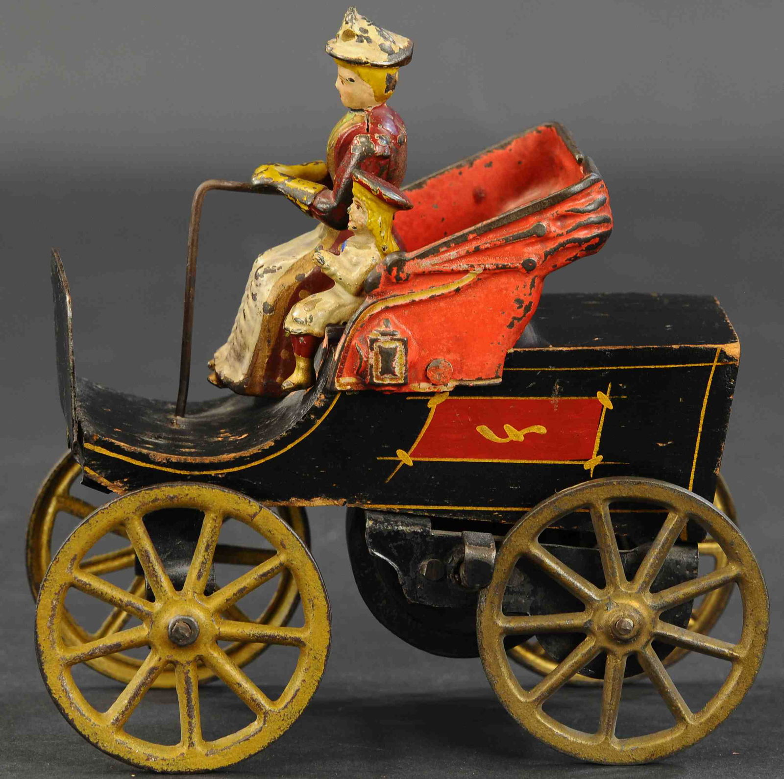 SoldA D.P. Clark hill climber toy horseless carriageA D.P. Clark hill climber toy horseless carriageCirca 1903UnmarkedThe toy with painted tin and wood body, metal wheels powered by a friction drive, and polychrome cast iron riders and driver, one withSee Sold Price