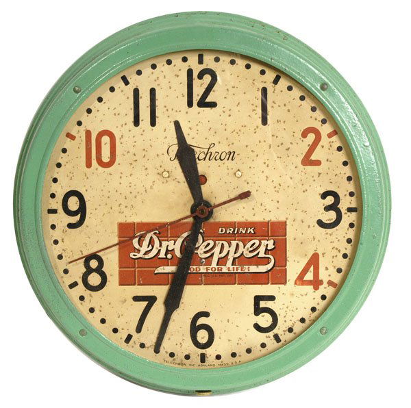SoldDr. Pepper Telechron ClockDr. Pepper Telechron Clock, Mid 20th Century, An advertising wall clock for Dr. Pepper by Telechron. Metal painted frame, Arabic numerals with red numbers at the 2, 4 and 10. Has electric cord which pSee Sold Price