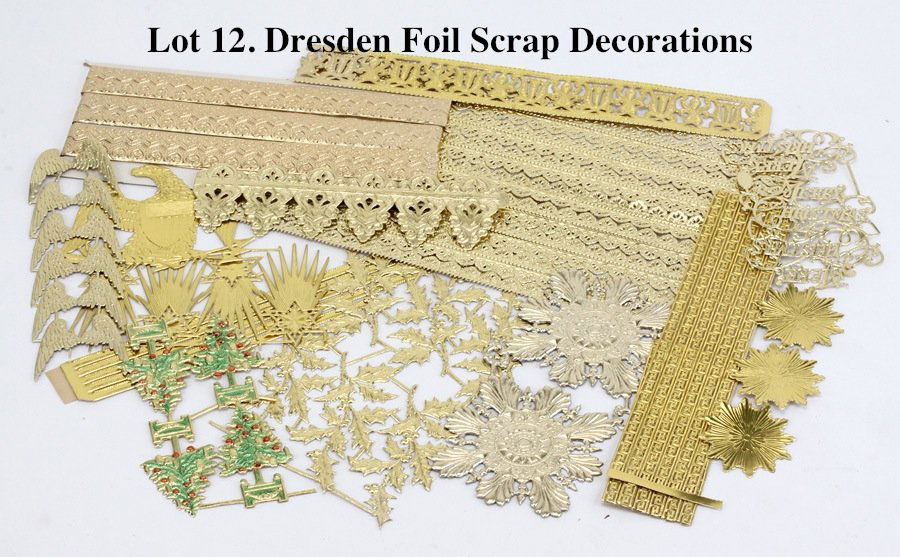SoldLot Of Antique Christmas Decorations Made from German Tinsel, Die Cut, and ScrapAssorted vintage German Christmas items mostly antique die cut or scrap decorations with tinsel-work.enhancements. The portrait of a girl on a banjo head is 10 1/2". The lot contains one large 20" SanSee Sold Price