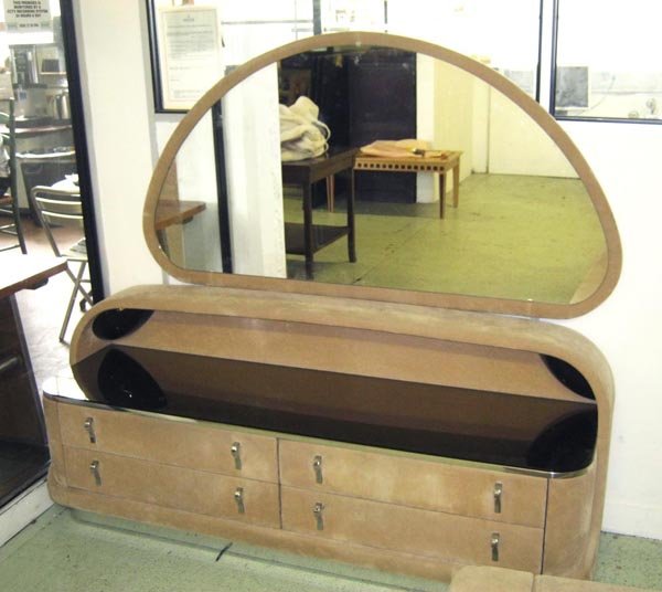 SoldA RIGSBEE STUDIO HOLLYWOOD REGENCY MIRROR CLAD EIGHTA RIGSBEE STUDIO HOLLYWOOD REGENCY MIRROR CLAD EIGHT DRAWER DRESSING TABLE, DALLAS, TEXAS, CIRCA 1950, composed of two four drawer stacks with bevel edged mirror cladding, joined by an in curved mirroSee Sold Price