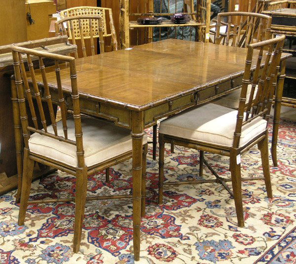 FAUX BAMBOO GAMES TABLE AND FOUR MATCHING CHAIRS HAVING LEAF DESIGN IN THE LEATHER C 1960.Kamelot Auctions4.4(346)$225(2 bids)Mar 24, 2026