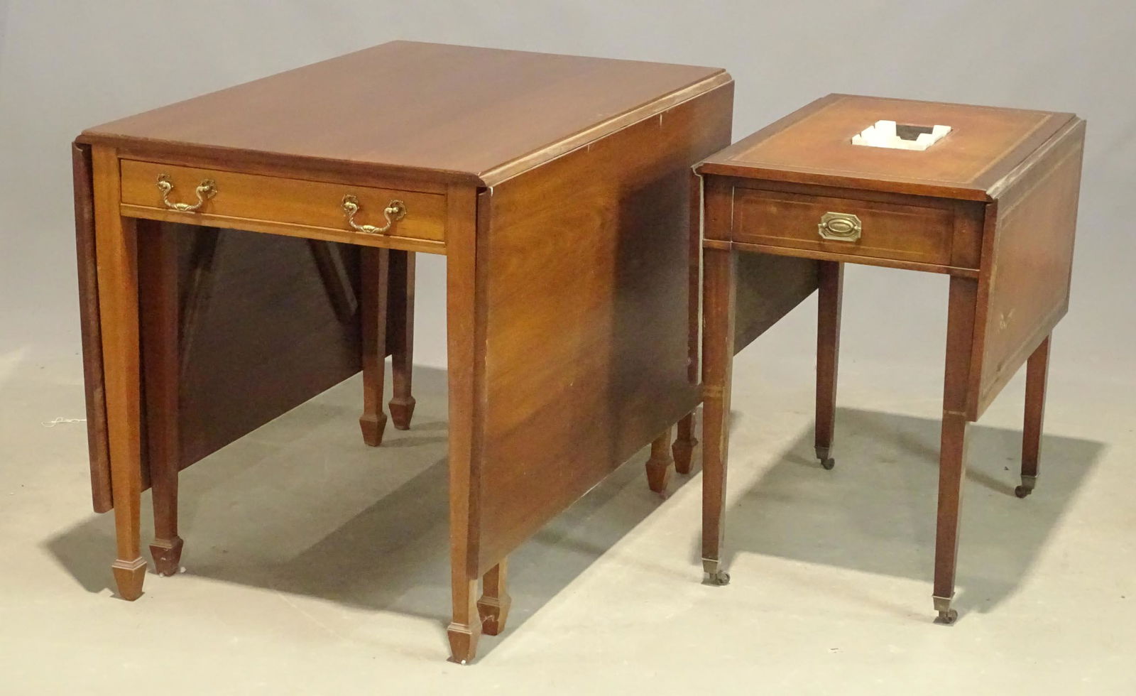 SoldPair of Inlaid Mahogany Pembroke Dropleaf Tables.There is a tiny bit of inlaid veneer missing from the front of one of the tables, and a bit of wear; otherwise, these are in good overall condition. They measure 27 3/4" tall, 19" wide (with the leaveSee Sold Price