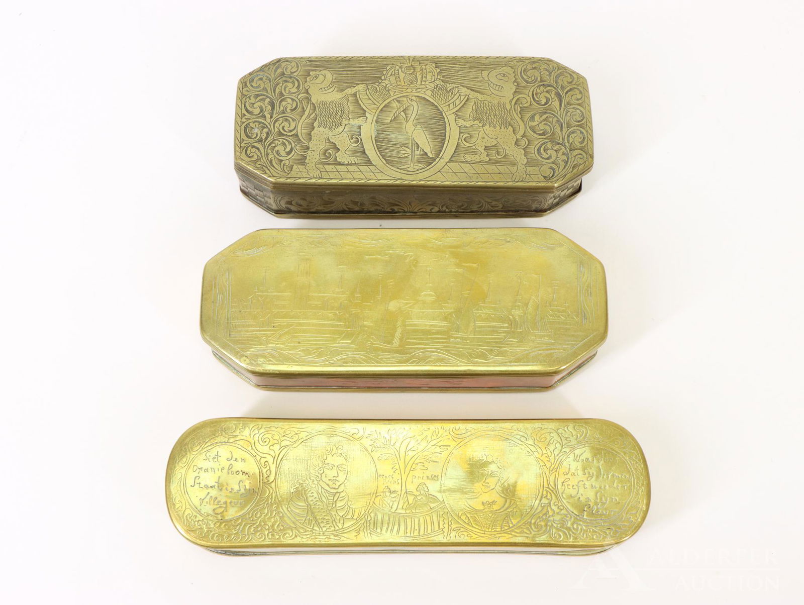 VINTAGE LADIES NECESSAIRES LOT LOCKET BOXES1 day LeftLot of Fenton Plates & Gilded Humidor w/ Horses.1 day LeftAntique Bronze Desk Accessories2 days Left(2) DUTCH BRASS AND COPPER TOBACCO BOXES, 19TH CENTURYFeb 21, 20263 copper 18th century Dutch tobacco boxes with finely engraved genre scenes and textsFeb 15, 20262 18th century copper Dutch tobacco boxes with finely engraved texts and genre scenesFeb 15, 2026Group of Three French Gilt-Metal Trinket Boxes5 days Left2 18th century copper Dutch tobacco boxes, one with a historical inscription (Battle of Minden) withFeb 15, 2026A Collection of Four Enameled and Engraved Brass Decorative ItemsFeb 15, 2026A gilt metal mounted amboyna and bronzed electrotype jewellery casket, an engraved brass and ivo...Two Brass Tobacco Boxes.5 days LeftA George IV silver-gilt and gold mounted snuff box Alexander J Strachan, London 1824(5PC) VICTORIAN BRASS DESK ACCESSORIESFeb 20, 2026A brass mounted leather playing card case, a gilt bronze mounted leather covered jewellery caske...Two 19thC Dutch .833 Silver Ornate Boxes2 days LeftTiffany Studios Gilt Bronze Zodiac Stamp Box Circa 1900-19203 days Left