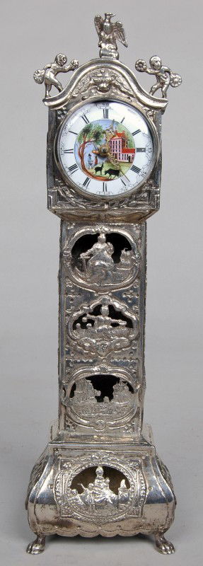 DUTCH MINIATURE SILVER TALL CLOCK, 19TH C eagle fi