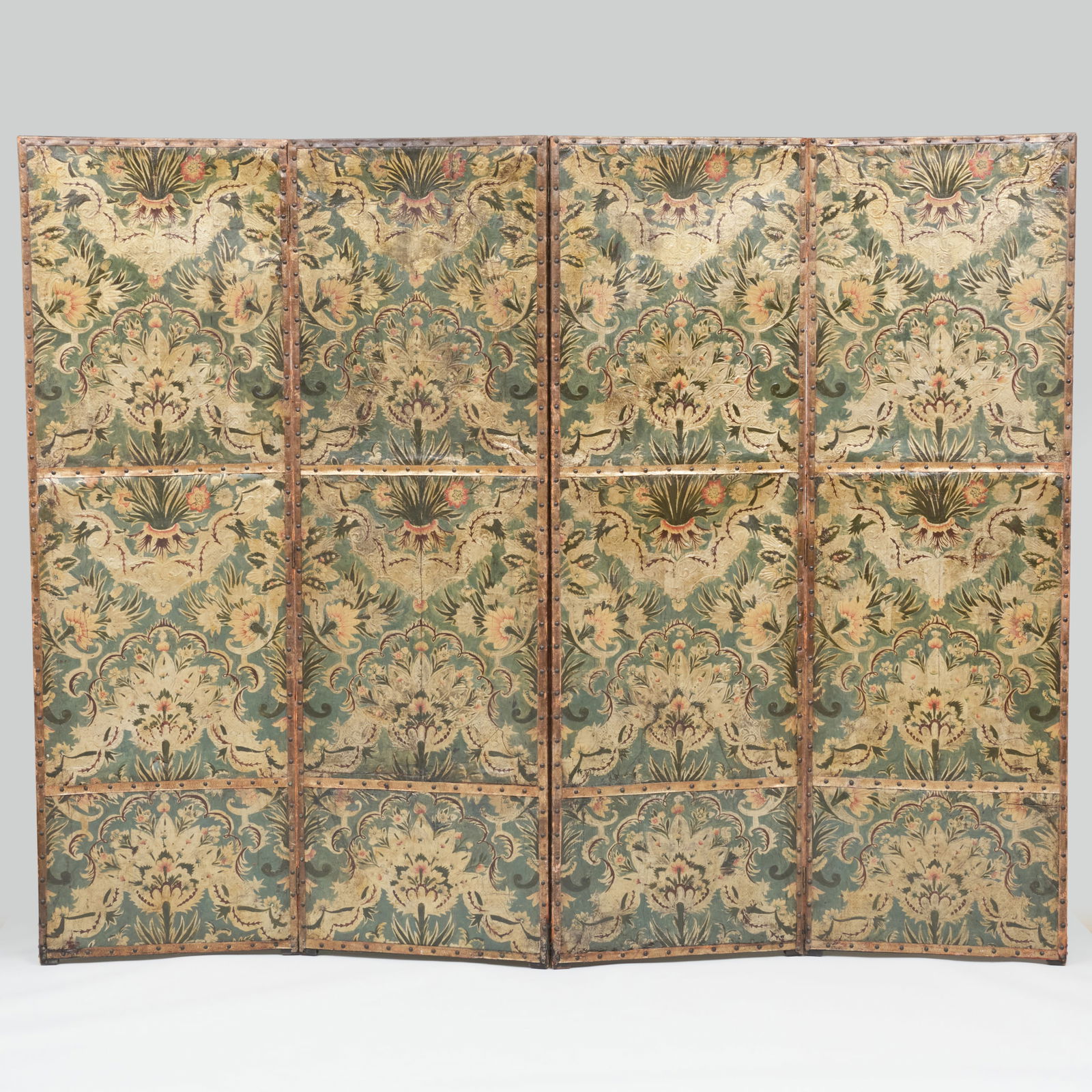 Early 20th Century Hand Painted Leather Four Panel Screen