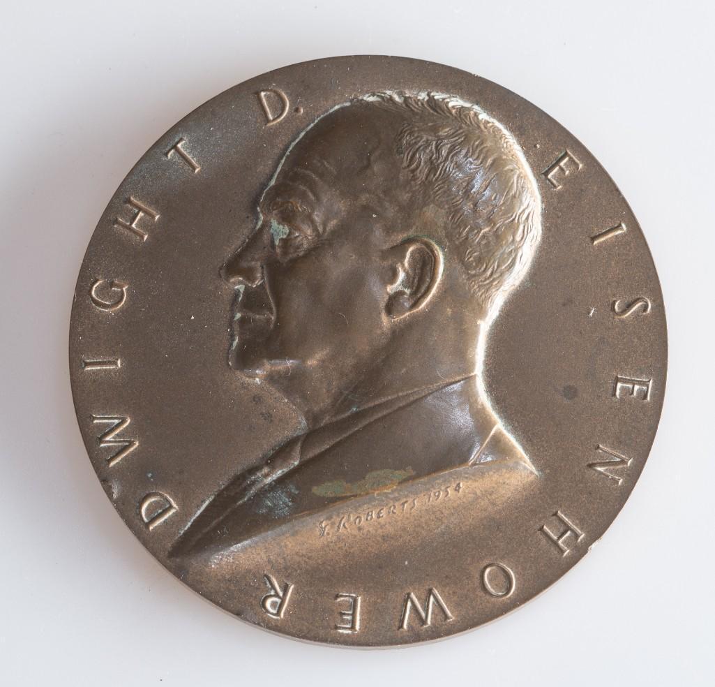 SoldEISENHOWER BRONZE INAUGURATION MEDAL, 1953Gilroy Roberts (American/Pennsylvania, 1905-1992). Inaugural commemorative medallion for President Dwight D. Eisenhower, dated January 20, 1953. Signature under bust.. Approx. 3" dia.See Sold Price