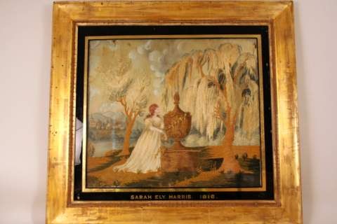 E. 19C AMER MEMORIAL NEEDLEWORK& PAINTED PICTURE