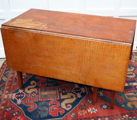 E. 19TH C. TIGER MAPLE DROP LEAF TABLE, N.E. ORIGIN