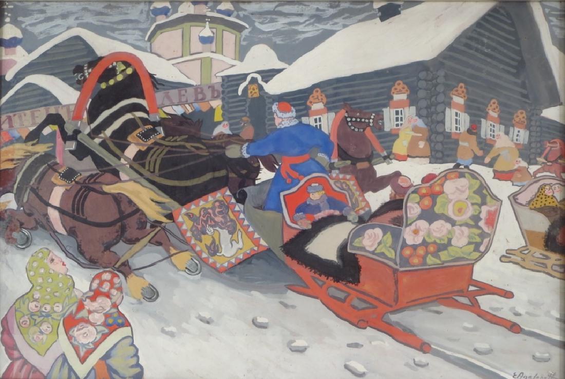 E.A. Agafoneff, Sledding Scene, Gouache, Signed.