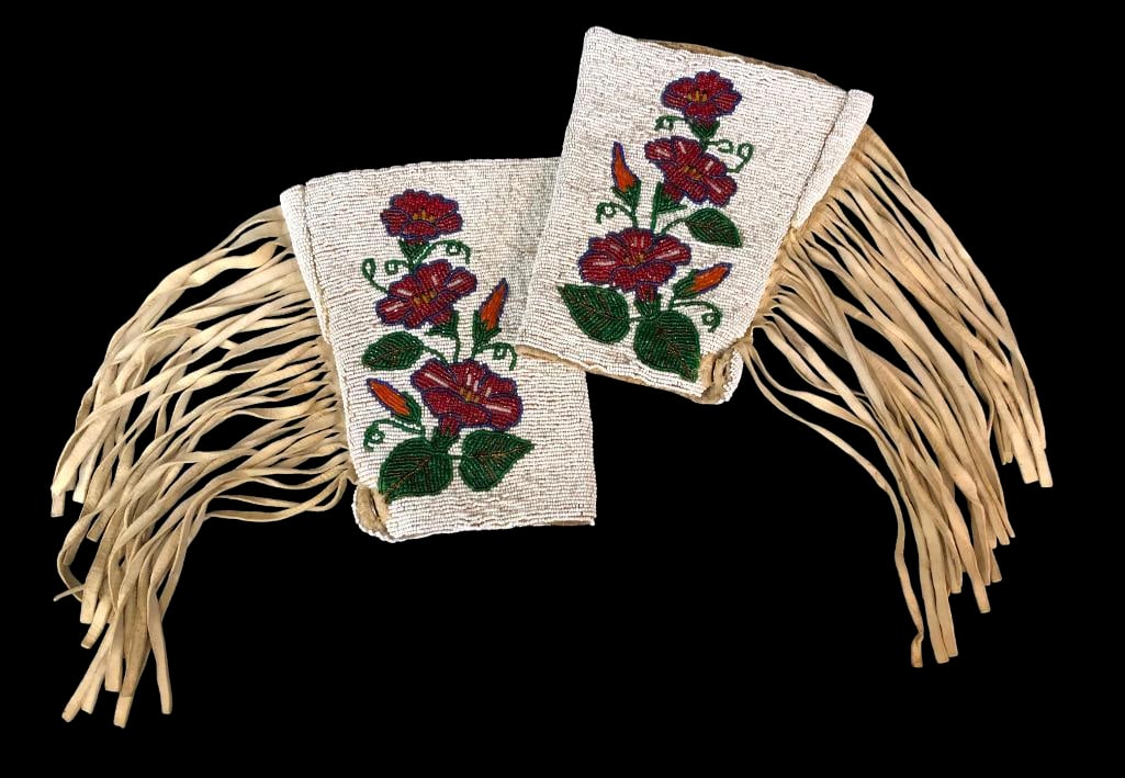 SoldPlateau Beaded CuffsEarly/Mid 1900s, Outstanding pair of longer buckskin wrist cuffs with fringed edges and colorful contour beaded roses on a unique diagonally flat beaded field. Very good condition. 8-1/2" x 6-1/2"See Sold Price