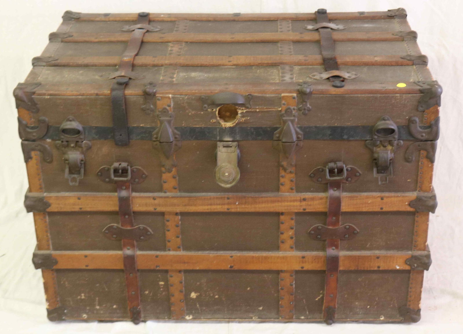 EARLY 20TH C. FLAT TOP TRUNK, MISSING HANDLE,