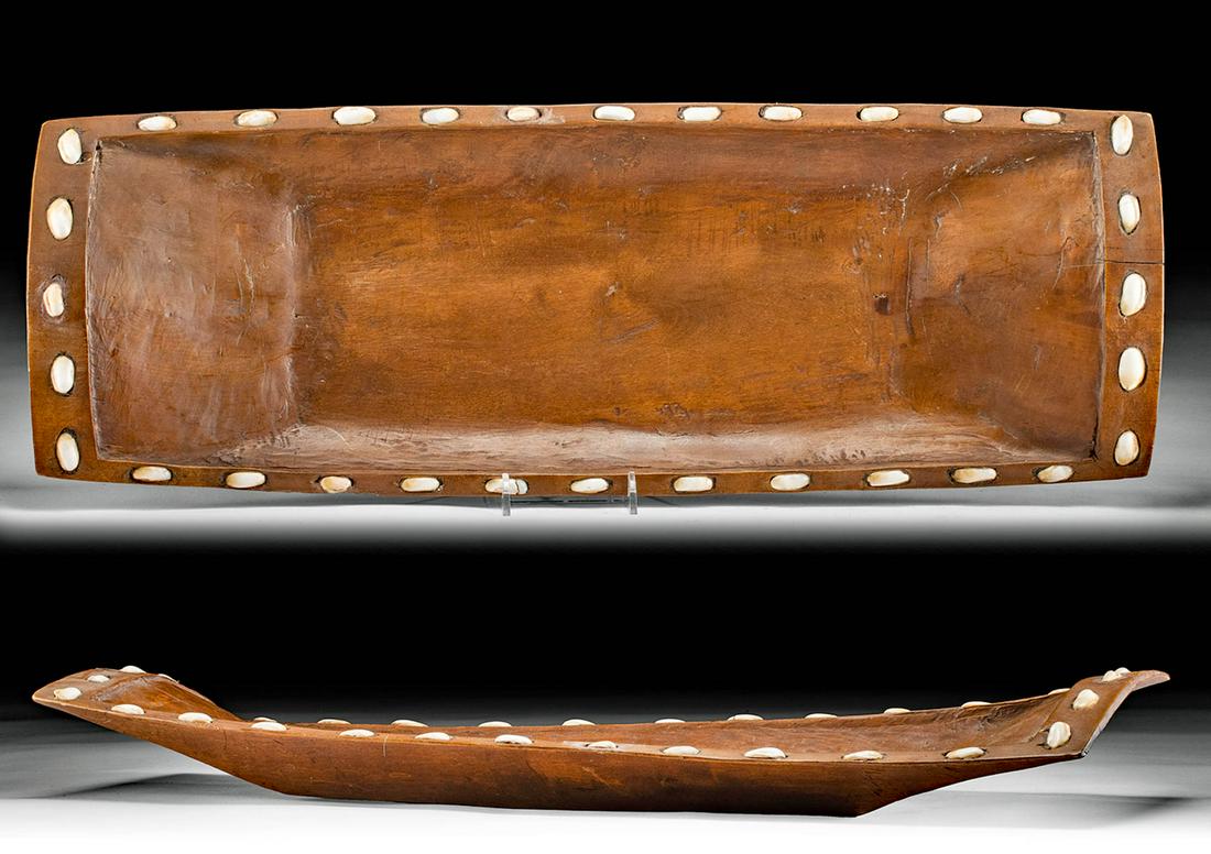 SoldEarly 20th C. Haida Wood Potlatch Bowl w/ Shell InlayNative American, Pacific Northwest Coast, Haida peoples, ca. early 20th century CE. A fabulous hand-carved wooden potlatch bowl of rectangular form adorned with a border of thirty-two inlaid shells. BSee Sold Price