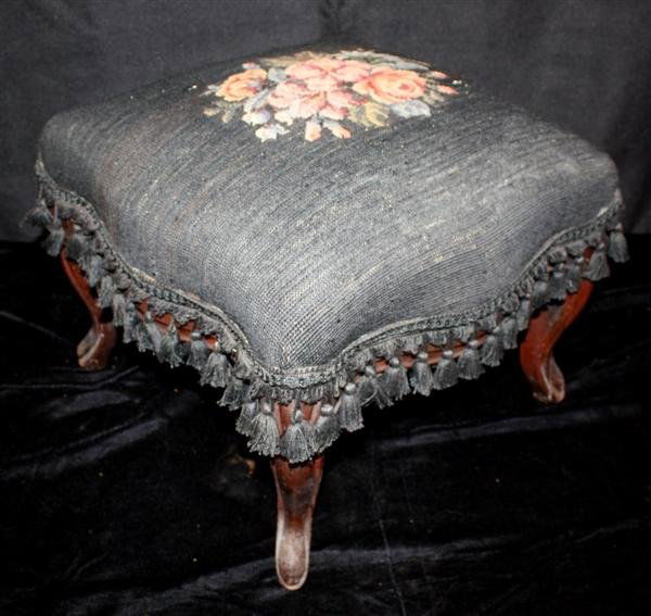 SoldAntique Footstool, More!These 3 quality footstools inlcude an oval, leather unpholstered carved floral base footstool with decorative brass tacks, an antique mahagony footstool with petit point upholstery, and a floral brocaSee Sold Price