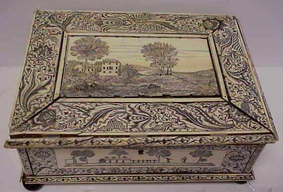 LARGE ANTIQUE CONTINENTAL PEN ENGRAVED TILED BONE TABLE BOXMay 03, 2026Dan Nelsen (Ojibwe), Incised Bear BladeApr 25, 202618th Century Renaissance Lombardy Cabinet in Ebony and BoneApr 26, 2026Fine Persian Antique Bone Box with Hand Painted Hunting Scenes4 days LeftANGLO-INDIAN BONE-INLAID & MIRRORED TEAK CABINETMay 02, 2026AN ENGRAVED PERSIAN SILVER CIRCULAR BOX SIGNED BY MASTER LAHEJI Iran, Isfahan, early 20th centuryApr 22, 2026A Carved Organic Material Lidded Box, China, 19th Century4 days LeftRARE EARLY LIME SPATULA, YUAT RIVER, PAPUA NEW GUINEAAN ANGLO-INDIAN ENGRAVED BONE LIDDED BOX, CA. 1860, SCRIMSHAWMay 09, 2026A HUANGHUALI BRUSH POT WITH LANDSCAPE AND STORY SCENES4 days LeftBritish Silver Plated Repousse Jewelry Casket Box6 days LeftAsprey Sterling Silver Humidor Box 1949 Hand Engraved Scenes2 days LeftEight Pickard China Pieces with Landscape Scenes17 hrs LeftAntique Silver Plated Repousse Jewelry BoxApr 28, 2026A KHOLMOGORY SCHOOL CARVED BONE BOX WITH MUGHAL INFLUENCE, 18TH CENTURY6 days LeftA large early Victorian figured walnut and ebony games box Early 19th century