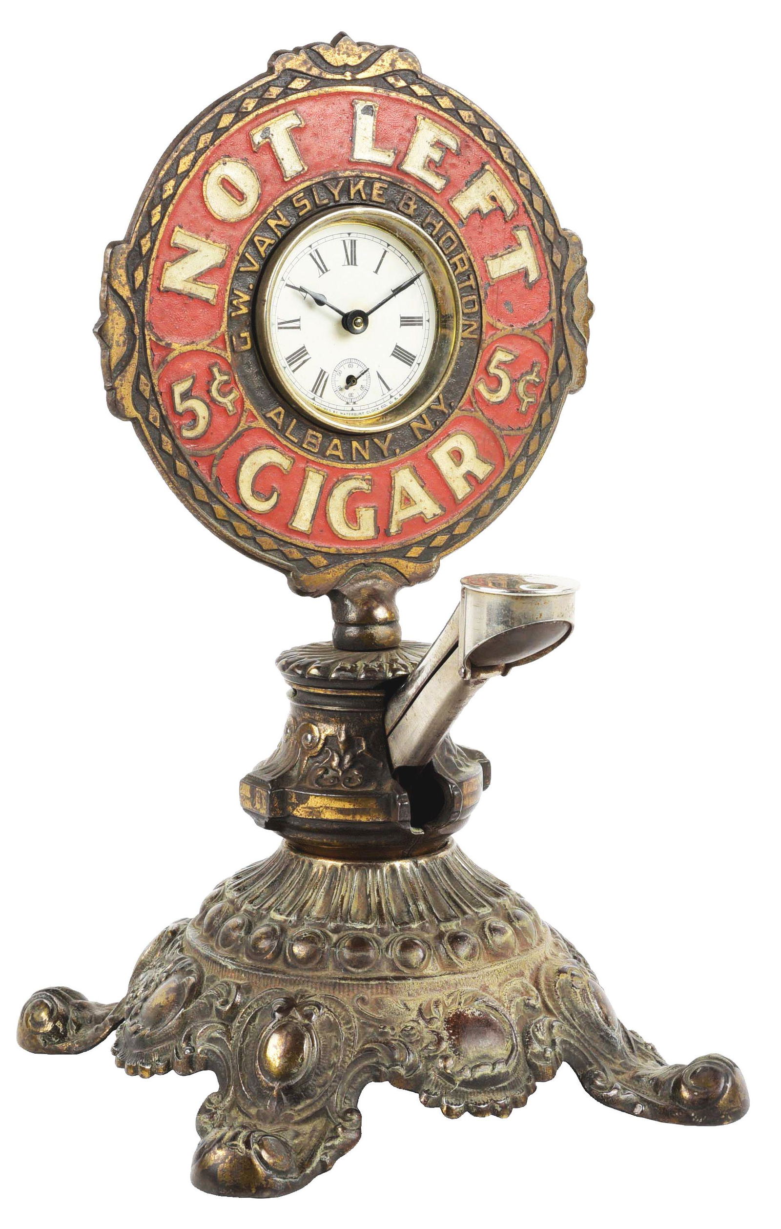 EARLY CAST IRON CIGAR CUTTER WITH CLOCK.
