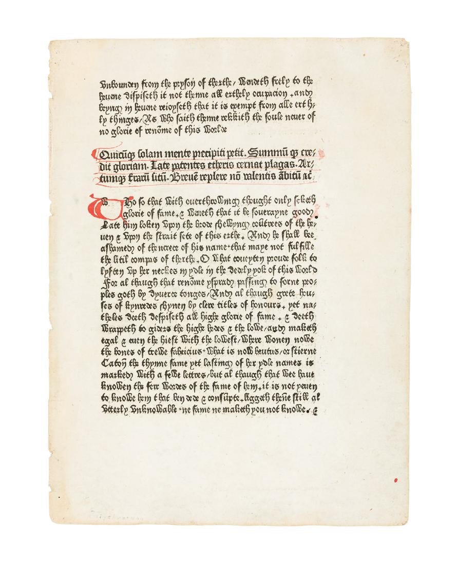 SoldEarly printed leaves.- Richard Pynson.- BonaventuraEarly printed leaves.- Richard Pynson.- Bonaventura (Saint, attributed to) Incipit speculum vite Cristi, 2 ff., 2 worm tracks to margins, lightly soiled, [STC 3262], [Richard Pynson], 1494; and a smalSee Sold Price