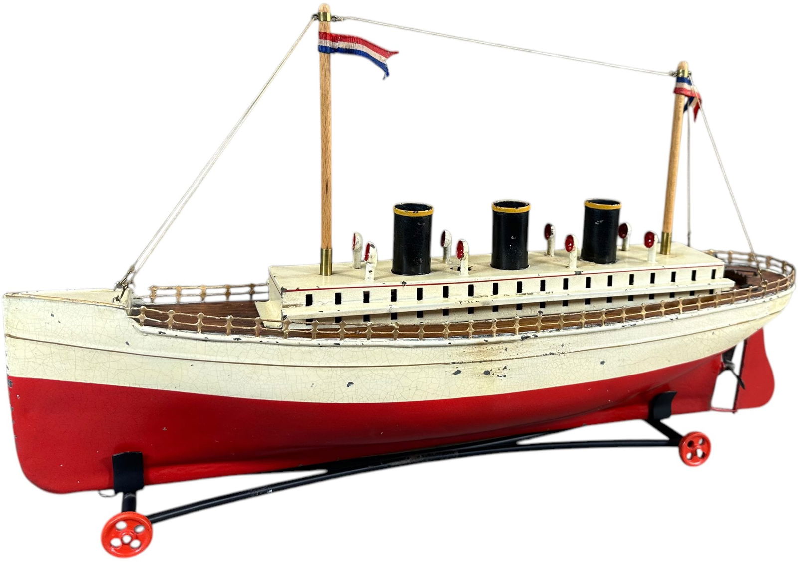 SoldBING Ocean Liner, sheet metal, handpainted, c. 1920, 37BING Ocean Liner, sheet metal, handpainted, c. 1920, 37 cm, 2 masts, 3 funnels, 2 lifeboats, Life Steam, steam drive, nice original condition, 2 propeller drive German Description BING Ocean Liner, BlSee Sold Price