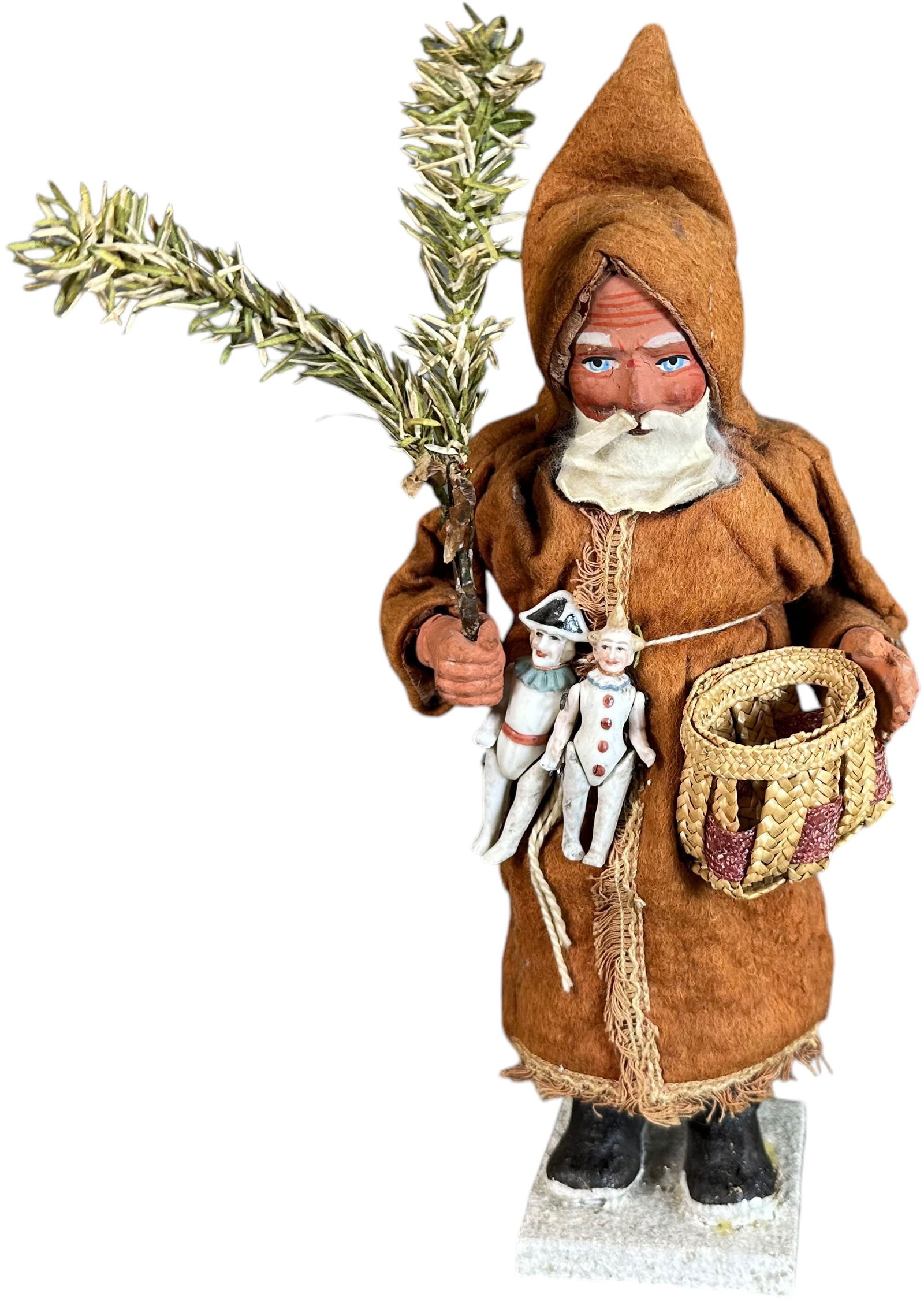 SoldAntique German Santa Candy ContainerNOT ELIGIBLE FOR IN-HOUSE SHIPPING - See Terms for Shipping Options. Santa with snow base decorated with mica and holding a feather Christmas tree. The hat is damaged possibly by moths. Height is 14 1See Sold Price
