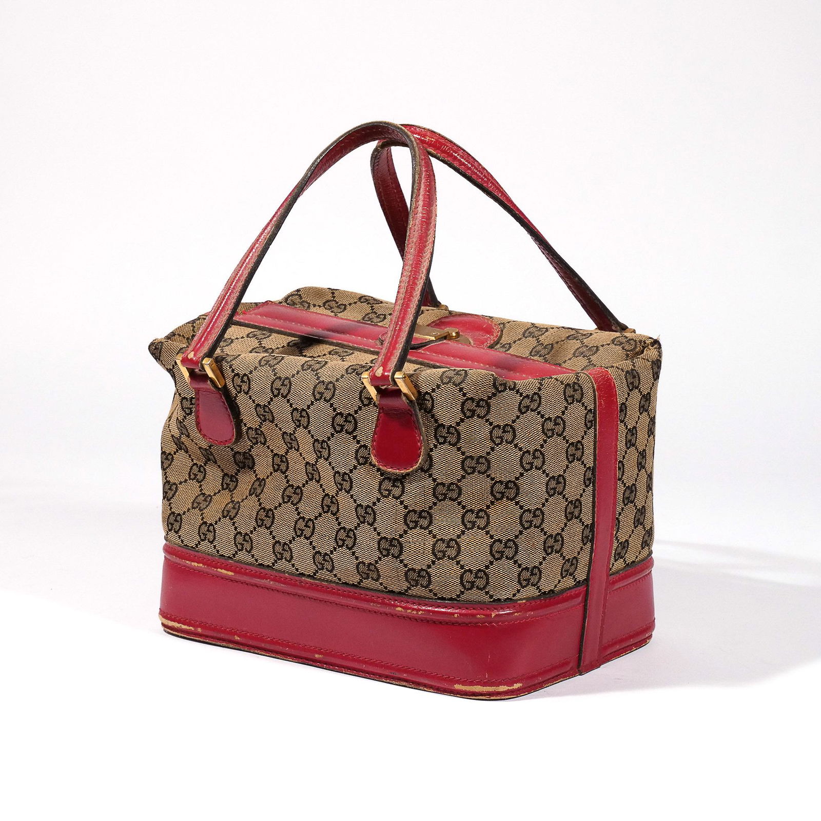 SoldEARLY GUCCI TRAIN BAGPatterned fabric with read leather trim and brass hardware h. 8 w. 11 d. 8 in.See Sold Price