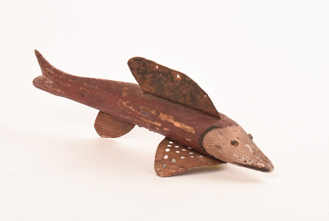 SoldUnusual Folk Art fish decoy: jointed wood bodyThis is an unusual fish decoy with a jointed wood body and metal fins. It is painted dark red with cream and black. The paint appears to have been sanded down to give it a more mottled, lifelike appeaSee Sold Price