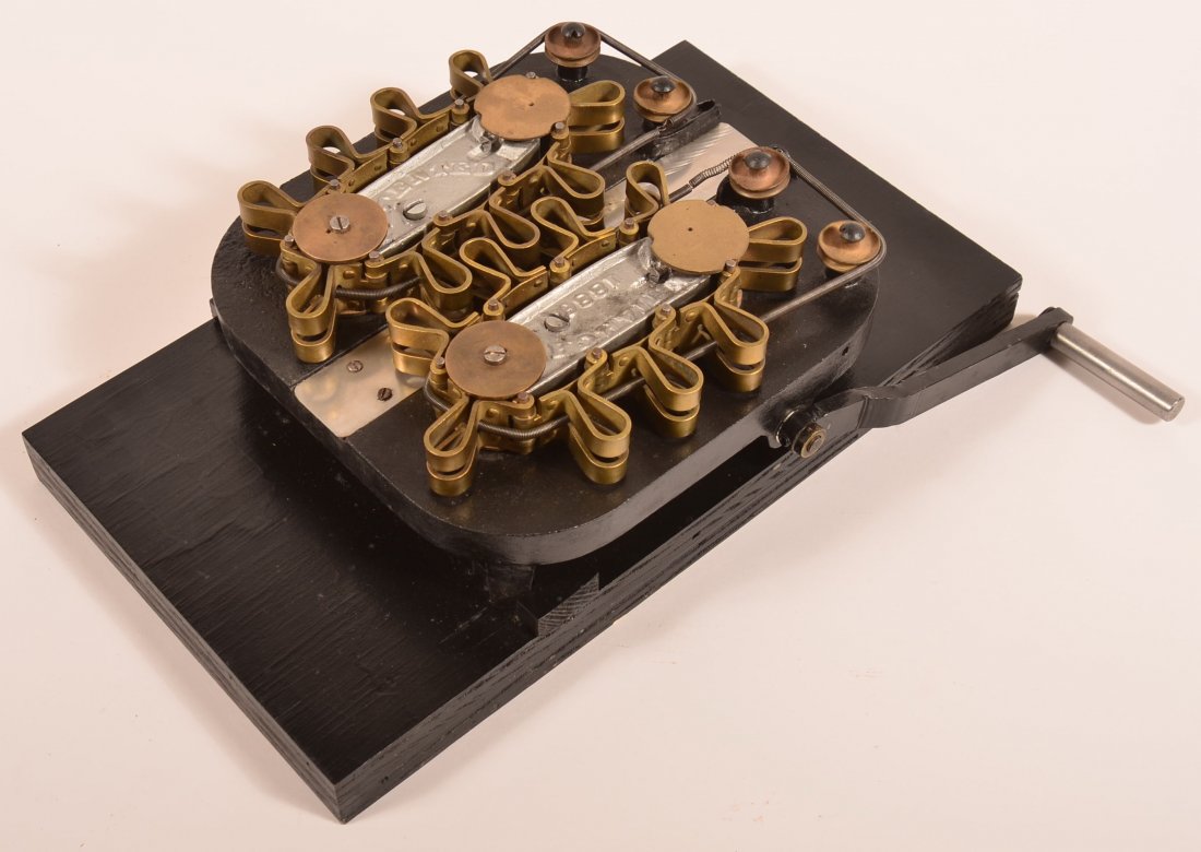PERRET BIPOLAR DYNAMO ELECTRIC MOTOR BY ELEKTRON MFG. CO. New York, Late 19th Century Height 8".Mar 12, 2026Bartholomew's Stenograph Typewriter, 1882 onwardsMar 14, 2026Pathé-Type Projection Head, c. 1905Mar 14, 2026LUNDELL ELECTRIC MOTOR OR DYNAMO ELECTRIC MACHINE Late 19th Century Total height 11.5". Base 7.5" xMar 12, 2026MARCHANT PINWHEEL CALCULATOR Oakland, California, Early 19th Century Case height 7". Width 14".Mar 12, 2026CHARLES SPIRO BAR-LOCK #6 TYPEWRITER New York, Late 19th Century Case height 10". Width 16". DepthMar 12, 2026C.&C. ELECTRIC MOTOR CO. TYPE 1N ELECTRIC MOTOR New York, Late 19th Century Height 10.5". BaseMar 12, 2026PERRET CONTINUOUS CURRENT DYNA-MOTOR BY ELEKTRON MFG. CO. Springfield, Massachusetts, Late 19thMar 12, 2026CASED CAST IRON STENOGRAPH Late 19th/Early 20th Century Stenograph height 3". Width 8". Depth 7.5".Mar 12, 2026RARE CHARLES T. CHESTER MORSE TELEGRAPH EMBOSSING REGISTER New York, Circa 1856-1858 Height 7.25".Mar 12, 2026GAMEWELL CO. FIRE ALARM TELEGRAPH UPRIGHT CALL BELL New York and Newton, Massachusetts, Early 20thMar 12, 2026J.H. BUNNELL & CO. TELEGRAPH KEY RELAY AND SOUNDER New York, Late 19th Century Height 4.25". WidthMar 12, 2026THOMAS EDISON'S PATENT NO. 13 STOCK TICKER Newark, New Jersey, Late 19th Century Ticker heightMar 12, 2026RARE SHOLES & GLIDDEN TYPEWRITER BY E. REMINGTON & SONS Ilion, New York, Late 19th Century HeightMar 12, 2026DALTON ADDING MACHINE Early 20th Century Height 11.5" (not including paper roll). Width 10". DepthMar 12, 2026Antique Brass Telegraph Relay / Sounder Mechanism – Early Electrical Device4 days Left
