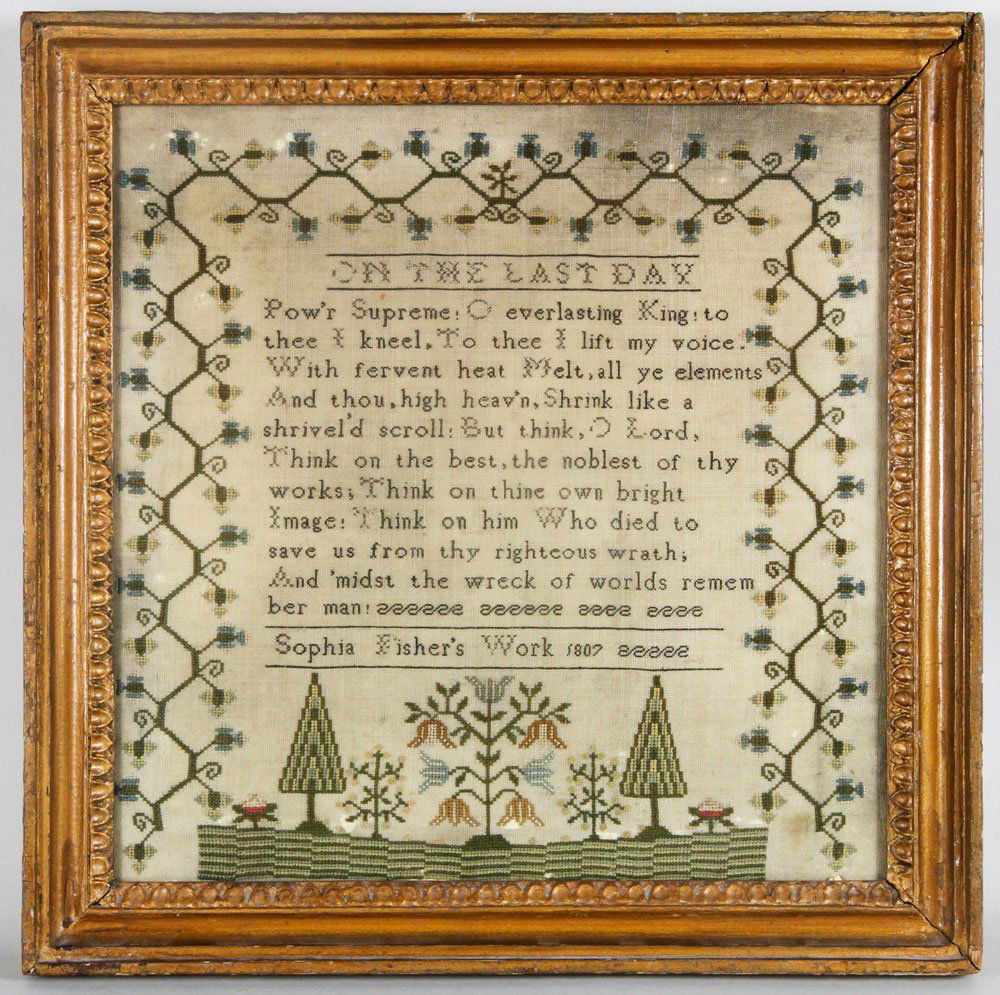 1825 SAMPLER2 days LeftDORCAS HAYNES ENGLISH SAMPLER, DATED 17172 days LeftSARAH M. LORD AMERICAN SAMPLER, DATED 18252 days LeftSARAH B. HOWLET ENGLISH NEEDLEWORK SAMPLER, DATED 18392 days Left18th/19th century English Needlwork SamplerFeb 27, 2026ANN TAPPAN AMERICAN NEEDLEWORK SAMPLER, DATED 17952 days LeftMARY ANN TILLEY ENGLISH NEEDLEWORK SAMPLER, EARLY 19TH CENTURY2 days LeftSOPHIA JAMESON SCOTTISH SAMPLER, DATED 18162 days LeftEARLY 19TH CENTURY AMERICAN PICTORIAL SAMPLER, CELIA LEACH, 18353 days LeftScottish Needlework SamplerMar 14, 2026EARLY 19TH-C. FOLK ART NEEDLEWORK SAMPLER3 days LeftCirca 1805 Needlepoint Sampler Aged 11 Framed and MattedMar 07, 2026English Needlework SamplerMar 14, 202618th century silk embroidered sampler, possibly American. Decoration of columns flanking the Lord'sMar 01, 2026TWO 19TH C. NEEDLEWORK SAMPLERS.6 days Left1833 Dated American Girlhood Needlework SamplerFeb 28, 2026