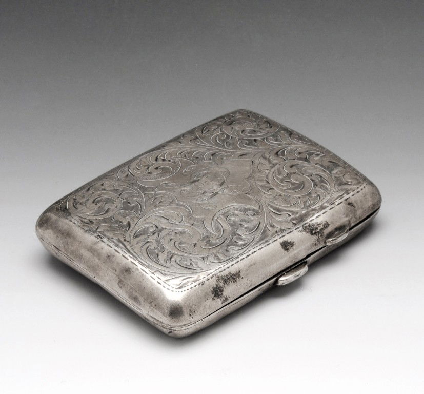 Late 19th/early 20th century Russian silver enamel cigarette case. Relief scrollwork decoration withLate 19th/early 20th century Russian silver enamel cigarette case. Relief scrollwork decoration with dark and light blue, white, and red enamels. Kokoshnik mark (1896-1908) and maker's mark (GK? in Cy