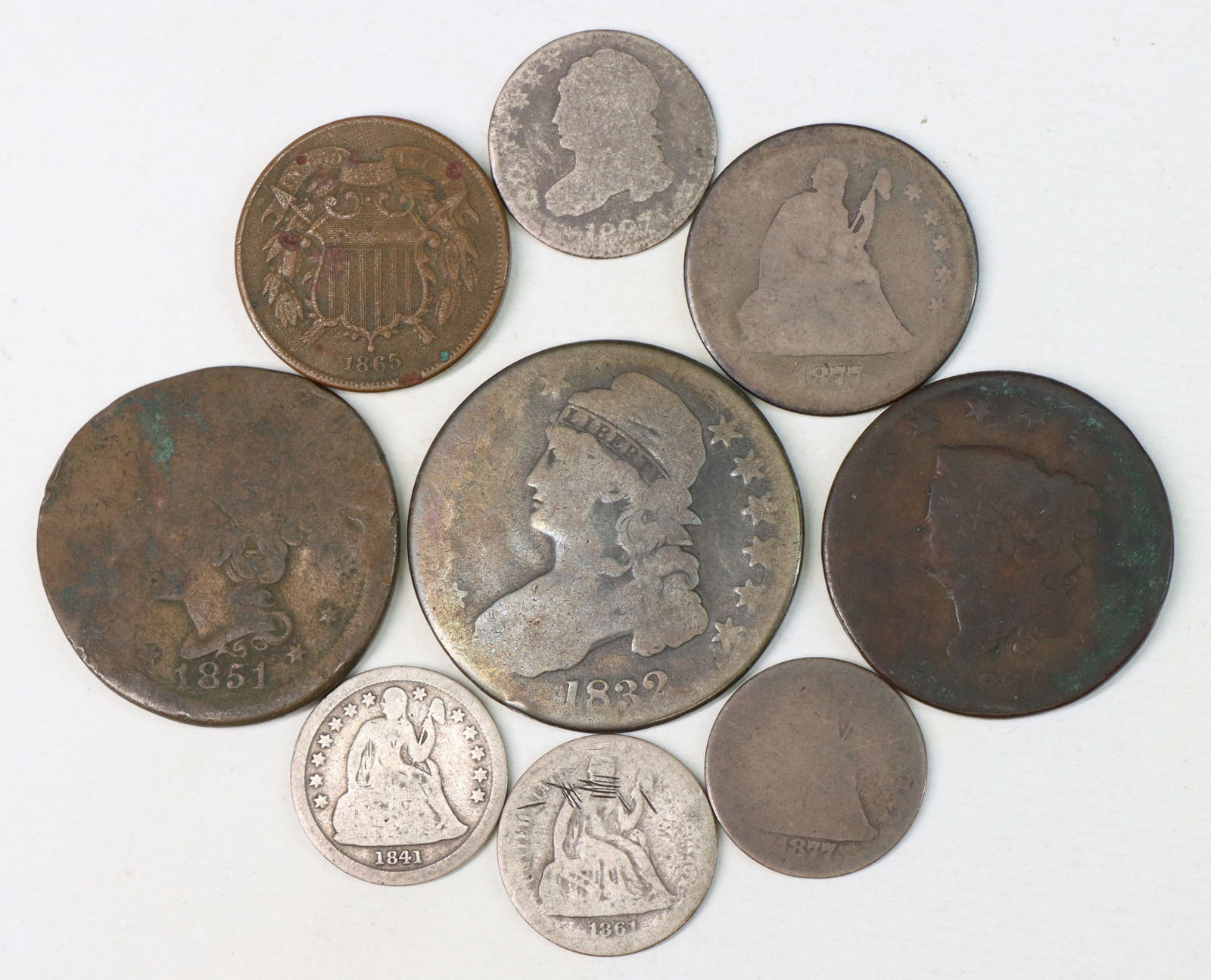 [7 Coins] 1827-1895 U.S. Large Cent& Quarter Lot2 days LeftLOT ASST. U.S. SILVER INCL. QUARTERS, DIMES, $6.70 F.V.Feb 21, 2026LOT ESTATE SILVER COINAGE INCL. 5 MORGAN/PEACE DOLLARSFeb 21, 2026Lot of 10 Circulated Coins including 1864 Two Cent with 180 Die Rotation4 days Left14 ASST U.S. SILVER HALF DOLLARS INCL. WALKING LIBERTY+Feb 21, 2026ASST US SILVER COIN INCL. HALVES/QUARTERS/DIMES/WARTIMEFeb 21, 2026Silver Bullion Commemorative World Coins 9pc LOT4 hrs Left19TH & 20TH C. US TYPE-COIN LOT3 days LeftLot of 10 Ten Silver Washington Quarters #4Jul 21, 2025Lot of 10 Ten Silver Washington Quarters #3Jul 21, 2025ASST FOREIGN SILVER COIN INCL. 1876 GERMAN FIVE MARK++Feb 21, 2026Lot of Eleven Circulated U.S. 90% Silver Mercury Dimes, 1935-1943Feb 17, 20265 Silver Dimes & Confederate tokenFour US Morgan Silver Dollars 90% Silver Dated 1883 1896 1897 1921Feb 17, 2026Group of Four U.S. Morgan Silver Dollars Dated 1880 1898 and 1899Feb 17, 20263 Large Cents, 2 Silver Dimes