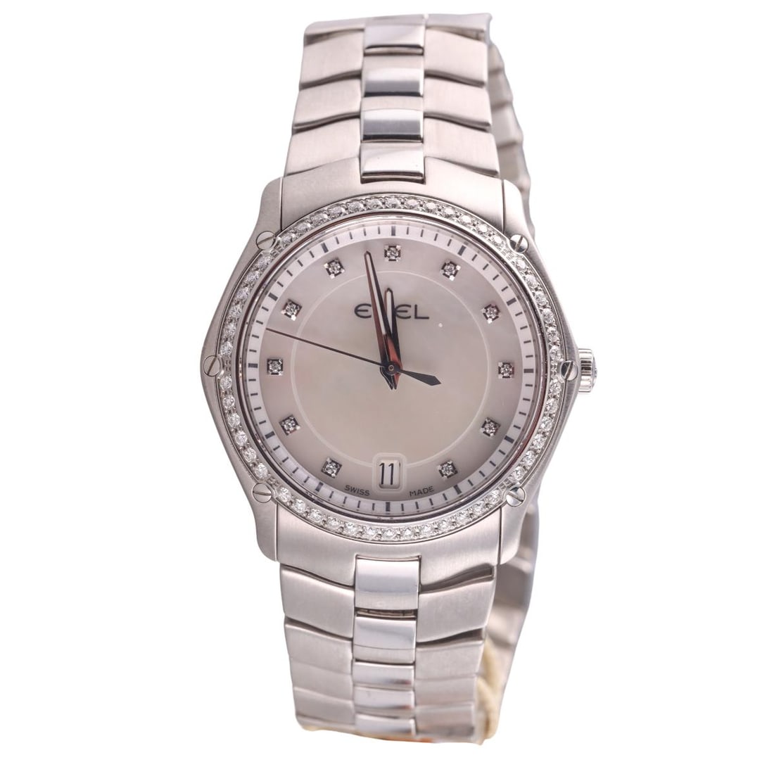 SoldEbel Classic Sport Mother of Pearl Diamond Stainless Steel Watch E9954O3SMetal : Stainless Steel Designer : Ebel Movement : Quartz Measurements : Case 32mm, full size bracelet with dual deployment buckle. Reference/Model: : Classi Sport E9954O3S. FunctiSee Sold Price
