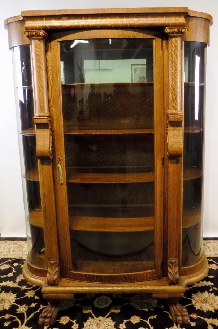 Sold1900'S AM. OAK TRIPLE BOW FRONT CHINA CABINETTRIPLE BOW FRONT SINGLE DOOR OAK CHINA CABINET. CLAW FOOT. MIRRORED UPPER BACK, SOME MINOR VENEER WEAR. 4 INTERIOR WOOD SHELVES. MINOR FINISH WEAR. 51" W x 17" D x 62" H. THIS ITEM EXCEEDS SIZE LIMITASee Sold Price