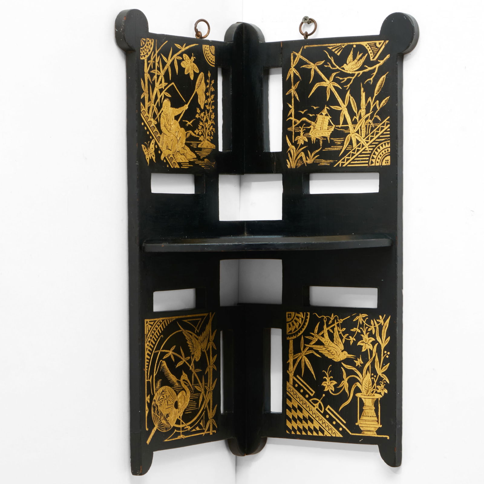 Ebonized and Parcel-Gilt Japonesque Corner Shelf