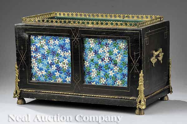 Ebonized, Gilt Bronze, Faience Mounted Jardiniere