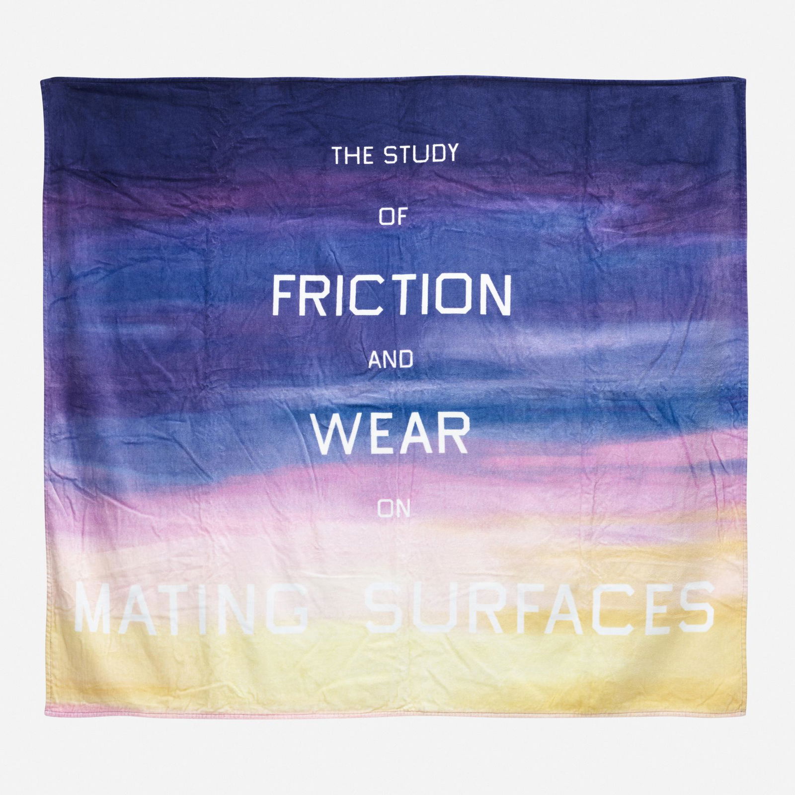 SoldTWO CONTEMPORARY BEACH TOWELSTwo cotton beach towels Tracey Emin, "I Love You," 2011 and Ed Ruscha "The Study of Friction and Wear on Mating Surfaces," 2009 Both with fabric label Publisher: Works on Whatever 70" x 60" (each)See Sold Price