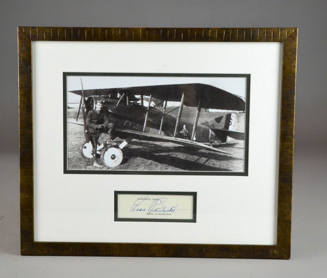 SoldMilitaria, Autograph "Capt. Eddie Rickenbacker"Militaria, Autograph "Capt. Eddie Rickenbacker" Signature cut on mint green paper signed in blue ink, framed w/1962 Leach Corp. reprint titled "Rickenbacker: America's Ace of Aces", Exc cond, 15.5"H xSee Sold Price