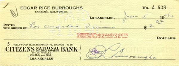 EDGAR RICE BURROUGHS SIGNED HANDWRITTEN CHECK