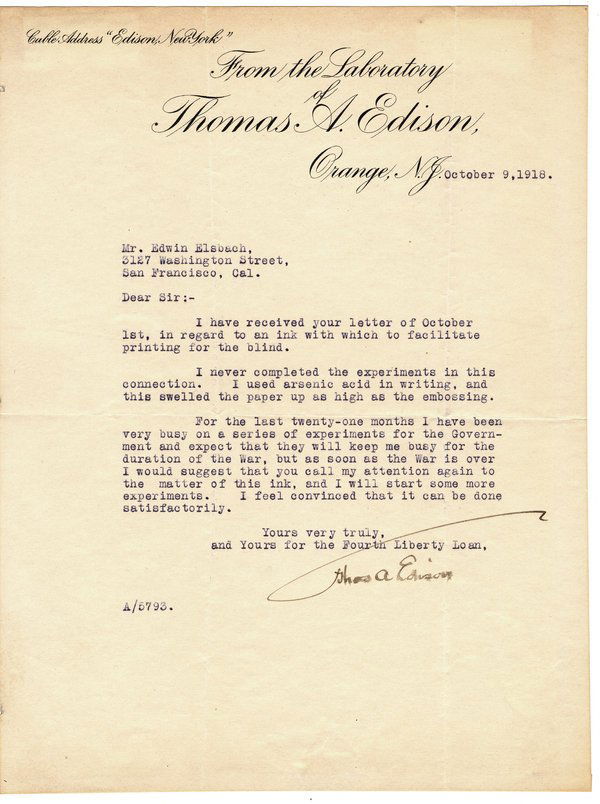 EDISON, THOMAS A. - TLS, 1918, war experiments