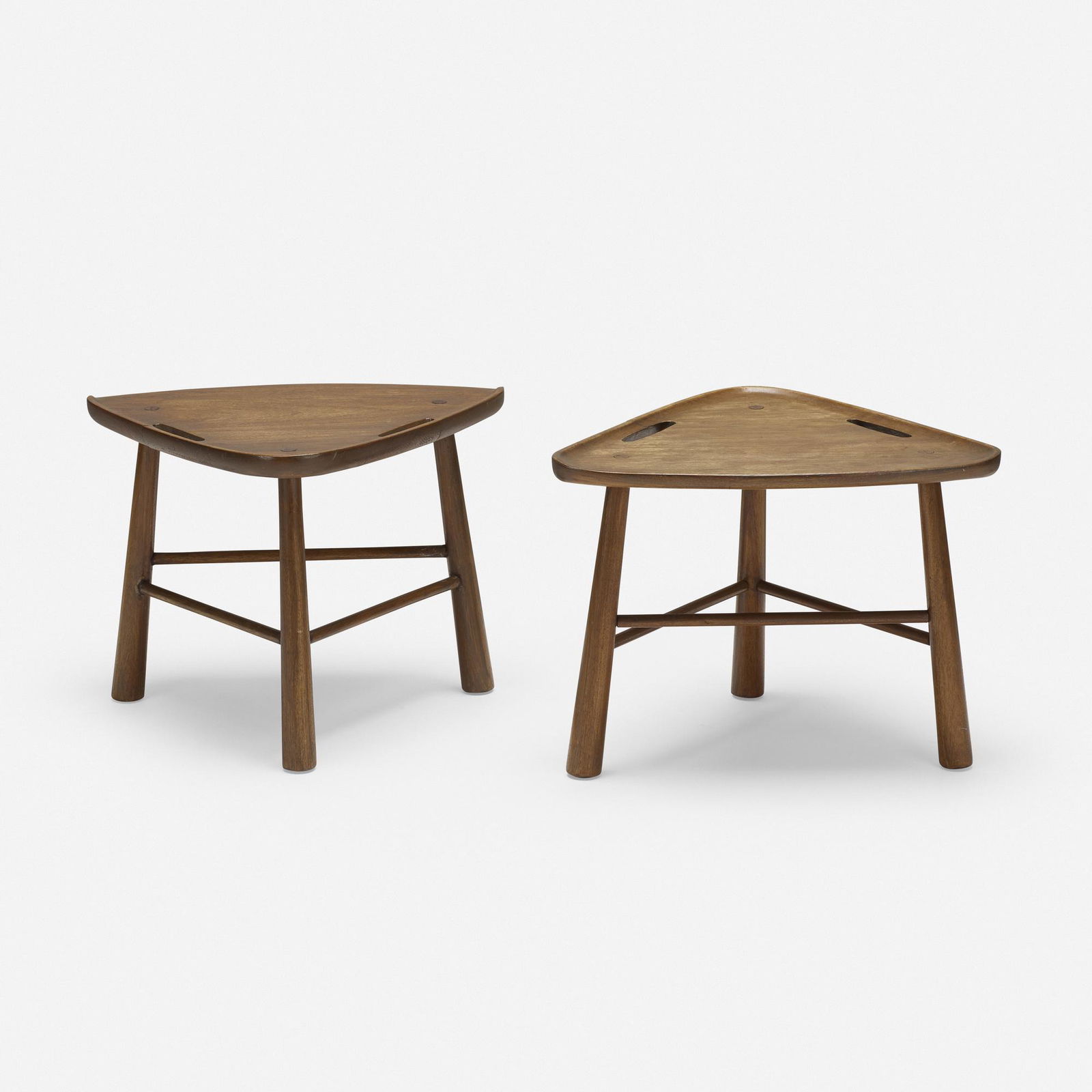 PAIR OF THREE LEG STOOLS IN BRAZILIAN MAHOGANY.